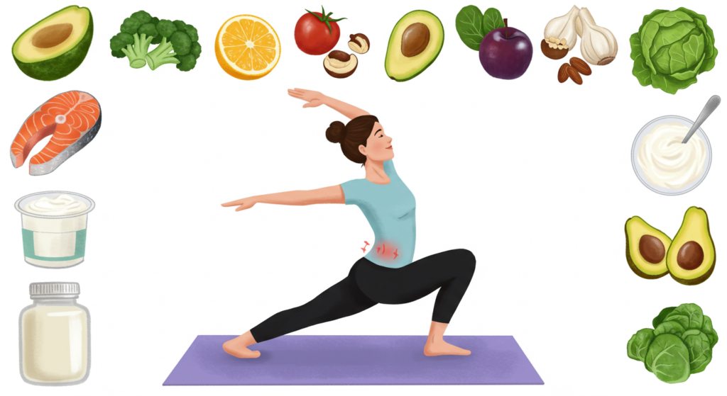 Makanan yang mempunyai sifat anti-radang dapat membantu mengurangkan sakit pinggang perempuan. Contohnya, makanan yang kaya dengan omega-3 seperti ikan salmon, biji chia, dan walnut dapat membantu mengurangkan keradangan dalam tubuh. Kajian menunjukkan bahawa diet yang kaya dengan omega-3 dapat mengurangkan kesakitan muskuloskeletal dan meningkatkan mobiliti.