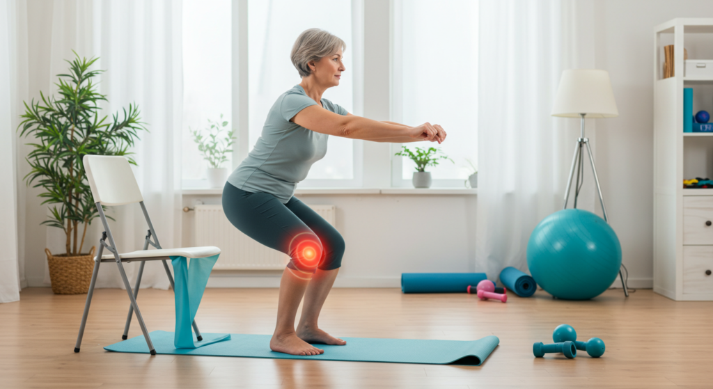 Squats adalah senaman untuk sakit lutut yang berkesan untuk menguatkan otot paha dan punggung. Untuk melakukannya, berdiri dengan kaki selebar bahu dan turunkan badan seolah-olah anda sedang duduk di kerusi. Pastikan lutut tidak melepasi jari kaki untuk mengelakkan tekanan berlebihan. Ulangi latihan ini sebanyak 10-15 kali. Senaman ini membantu membina kekuatan otot yang menyokong sendi lutut, yang sangat penting bagi mereka yang mengalami kesakitan lutut.