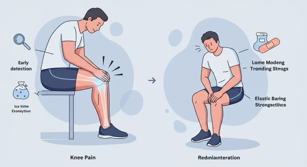 Pengenalan awal terhadap sakit lutut selepas bersukan adalah penting kerana ia membolehkan individu mengambil tindakan yang tepat sebelum masalah menjadi lebih serius. Apabila seseorang mula merasakan kesakitan di lutut selepas bersukan, ini mungkin merupakan tanda awal bahawa terdapat masalah yang perlu ditangani. Jika kesakitan dibiarkan tanpa rawatan, ia boleh menyebabkan kerosakan yang lebih besar pada sendi lutut. Sebagai contoh, jika seseorang mengalami kesakitan yang berterusan dan tidak mendapatkan nasihat perubatan, mereka mungkin berisiko mengalami kecederaan ligamen yang lebih serius atau kerosakan pada meniskus. Dalam kes ini, individu yang tidak mengambil tindakan awal mungkin mendapati bahawa mereka tidak dapat bergerak dengan bebas dan mengalami kesakitan yang lebih teruk, yang boleh mengganggu aktiviti harian mereka.