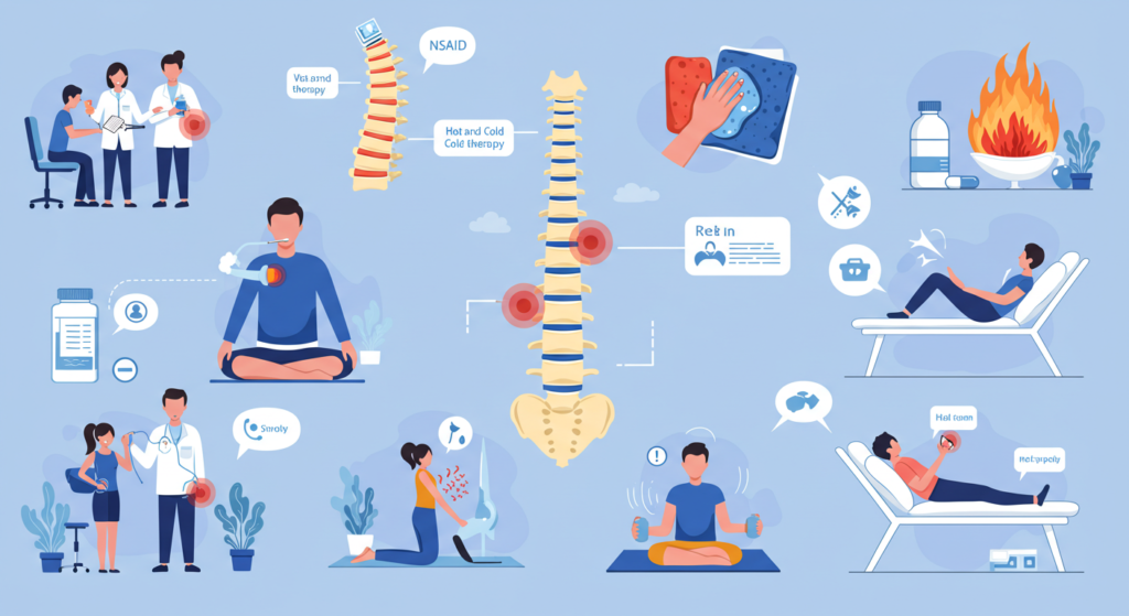 Rehat adalah langkah pertama yang penting dalam pengurusan sakit pinggang berpanjangan. Memberi masa kepada kawasan yang terjejas untuk pulih dapat membantu mengurangkan kesakitan dan mempercepatkan proses penyembuhan. Selain itu, fisioterapi adalah pilihan rawatan yang sangat berkesan, di mana pesakit dapat meningkatkan kekuatan otot dan fleksibiliti melalui program latihan yang disesuaikan. Penggunaan ubat anti-radang juga boleh membantu mengurangkan kesakitan dan keradangan, memberikan kelegaan sementara kepada pesakit. Terapi panas dan sejuk, yang melibatkan penggunaan pek ais dan kompres panas, dapat membantu mengurangkan bengkak dan mengendurkan otot yang tegang, memberikan kelegaan tambahan.