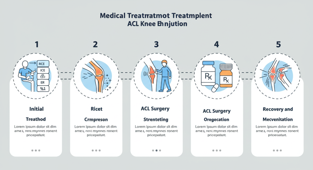 Setelah mengalami kecederaan sakit lutut ligamen anterior cruciate (ACL), langkah pertama yang perlu diambil adalah mendapatkan rawatan awal secepat mungkin. Rawatan awal ini sangat penting untuk mengurangkan kesakitan dan bengkak yang mungkin timbul akibat kecederaan. Salah satu langkah pertama adalah rehat, di mana individu perlu mengelakkan sebarang aktiviti yang membebankan lutut. Ini termasuk menghindari berjalan jauh, berlari, atau melakukan aktiviti sukan yang memerlukan pergerakan lutut yang intensif. Sebagai contoh, seorang atlet yang mengalami sakit lutut ACL mungkin perlu mengambil cuti dari latihan dan pertandingan untuk memberi masa kepada lutut untuk pulih.