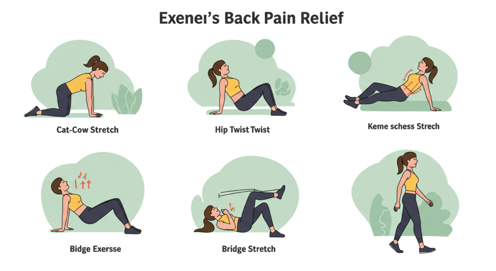 Senaman pertama yang akan dibincangkan adalah senaman kucing dan lembu (Cat-Cow Stretch). Senaman ini sangat baik untuk meningkatkan fleksibiliti tulang belakang dan mengurangkan ketegangan otot di kawasan pinggang. Dengan melakukan senaman ini secara berkala, wanita yang mengalami sakit pinggang perempuan dapat merasakan kelegaan yang ketara. Senaman kedua adalah latihan jambatan (Bridge Exercise), yang membantu menguatkan otot punggung dan pinggang. Latihan ini dapat memberikan sokongan tambahan kepada kawasan pinggang dan mengurangkan kesakitan.